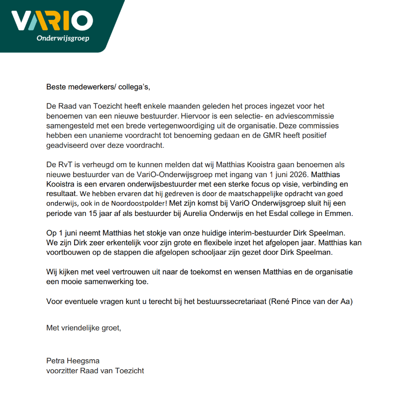 nieuwe bestuurder van de VariO-Onderwijsgroep met ingang van 1 juni 2026. Matthias